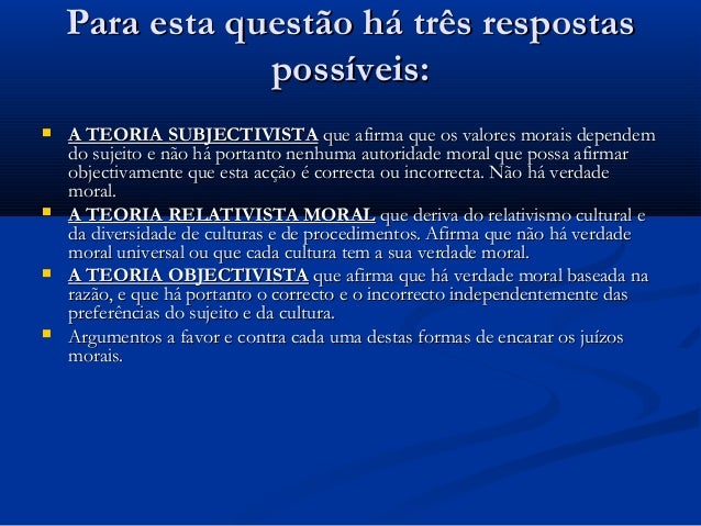 esta questão há três respostas possíveis: A TEORIA SUBJETIVISTA que afirma que os valores morais dependem do sujeito e