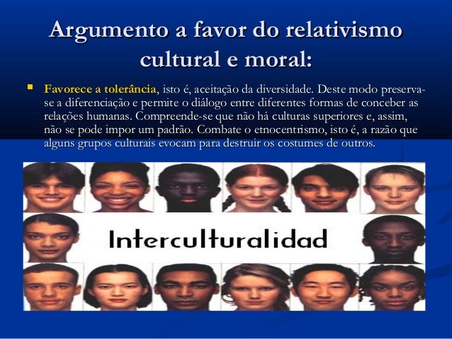 a favor do relativismo cultural e moral: Favorece a tolerância, isto é, aceitação da diversidade. Deste modo preserva-se