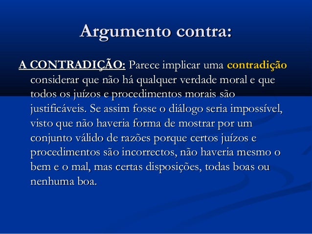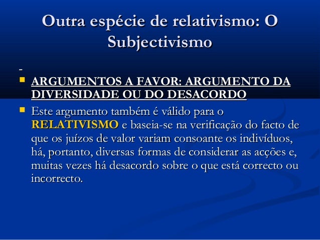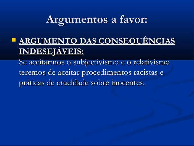 a favor: ARGUMENTO DAS CONSEQUÊNCIAS INDESEJÁVEIS: Se aceitarmos o subjetivismo e o