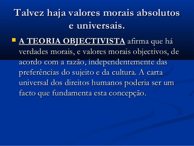 haja valores morais absolutos e universais. A TEORIA OBJETIVISTA afirma que há verdades morais, e valores morais objetivos,