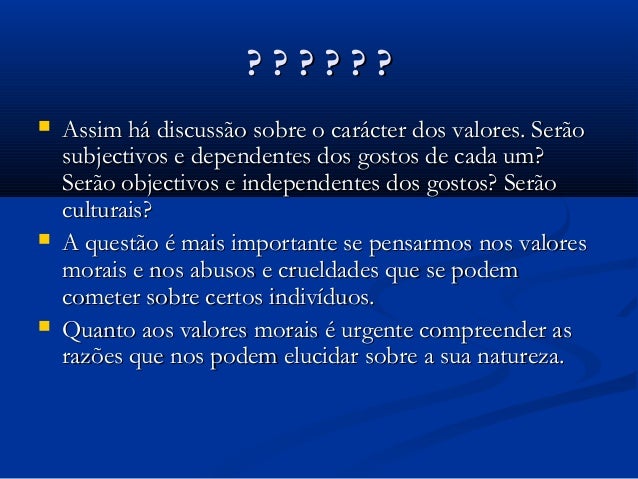 8. Assim há discussão sobre o carácter dos valores. Serão subjectivo e
